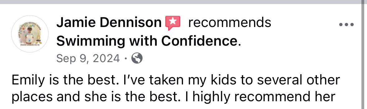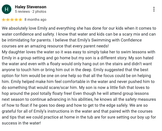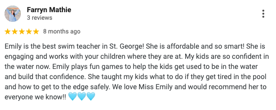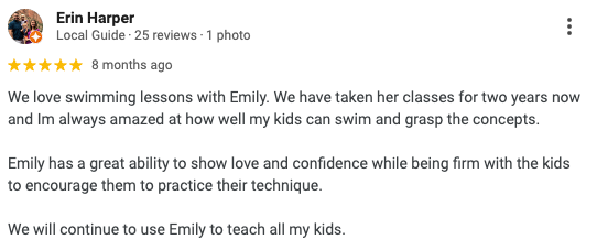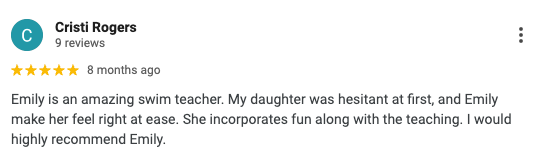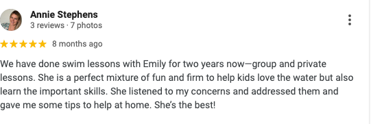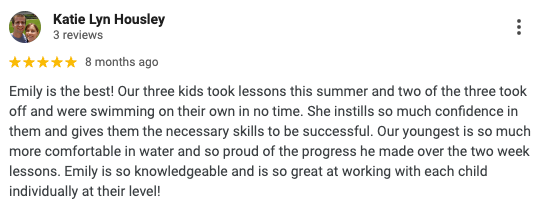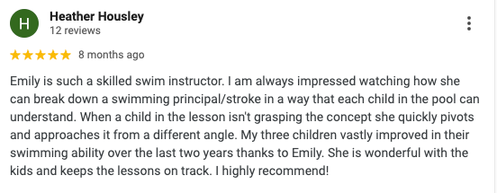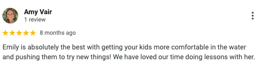 "Emily is absolutely the best with getting your kids more comfortable in the water and pushing them to try new things!"