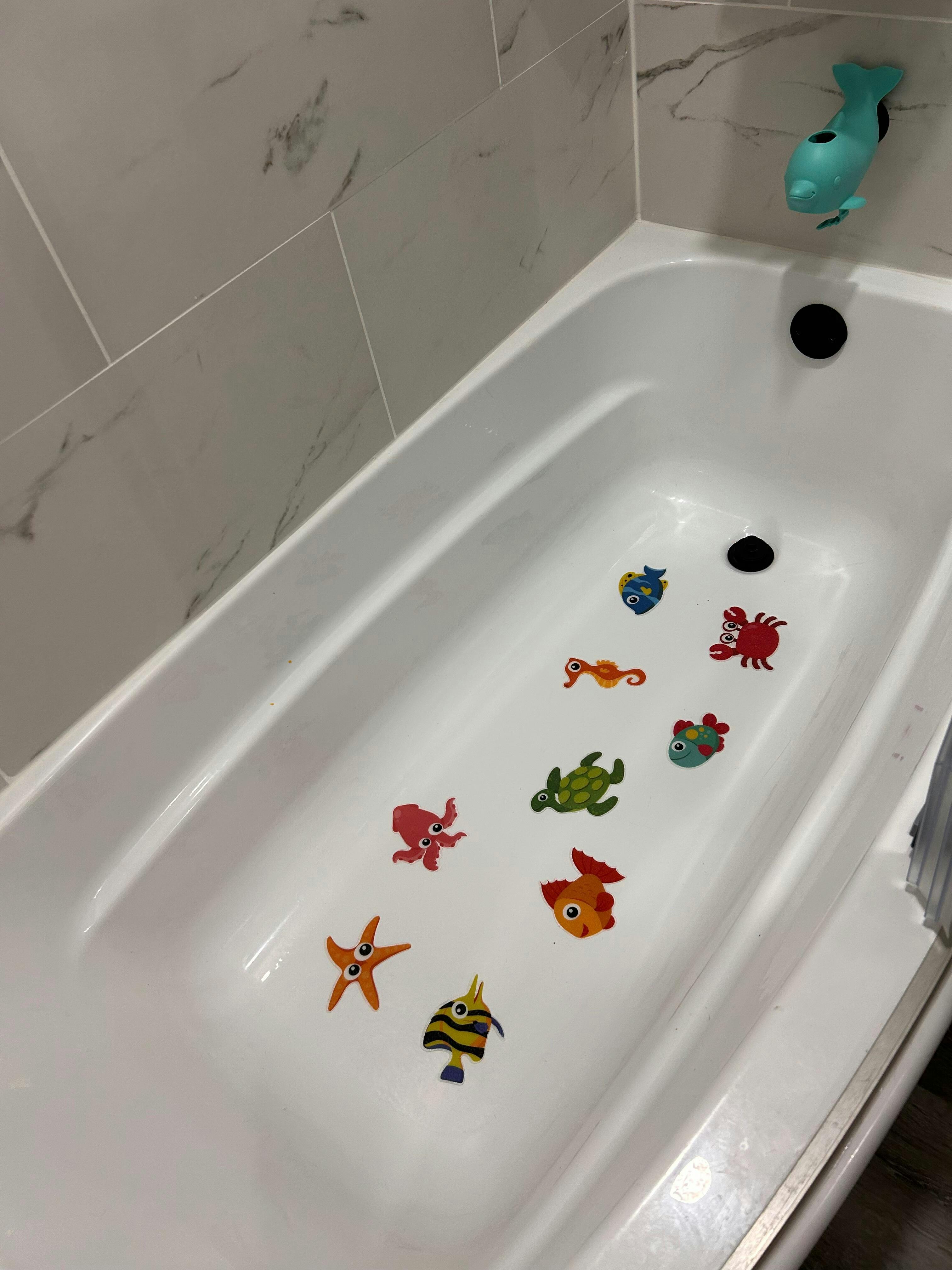We love our tub stickers. They are so cute and make bath time extra fun. The first few baths we had after installing them, my son didn’t even want extra toys because he was so fascinated by the sea creatures! He loves talking and blowing bubbles to them.